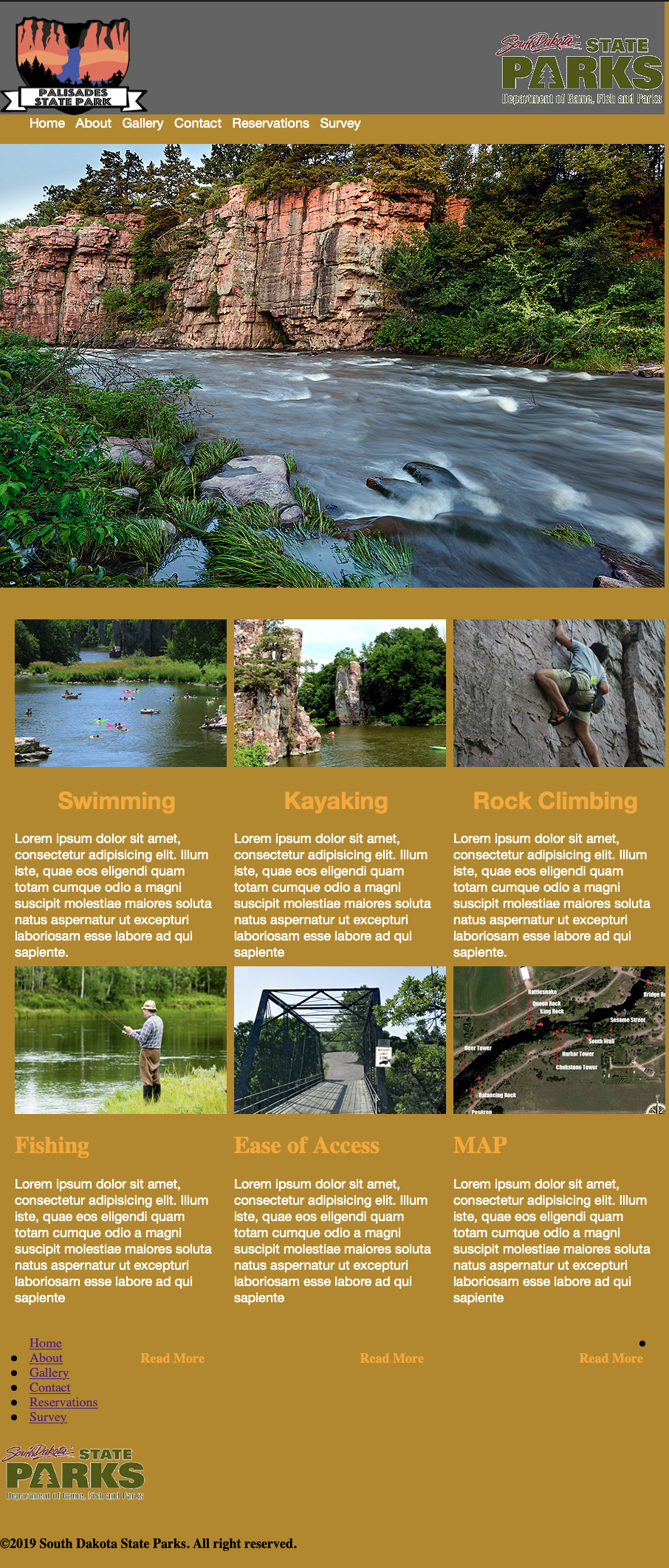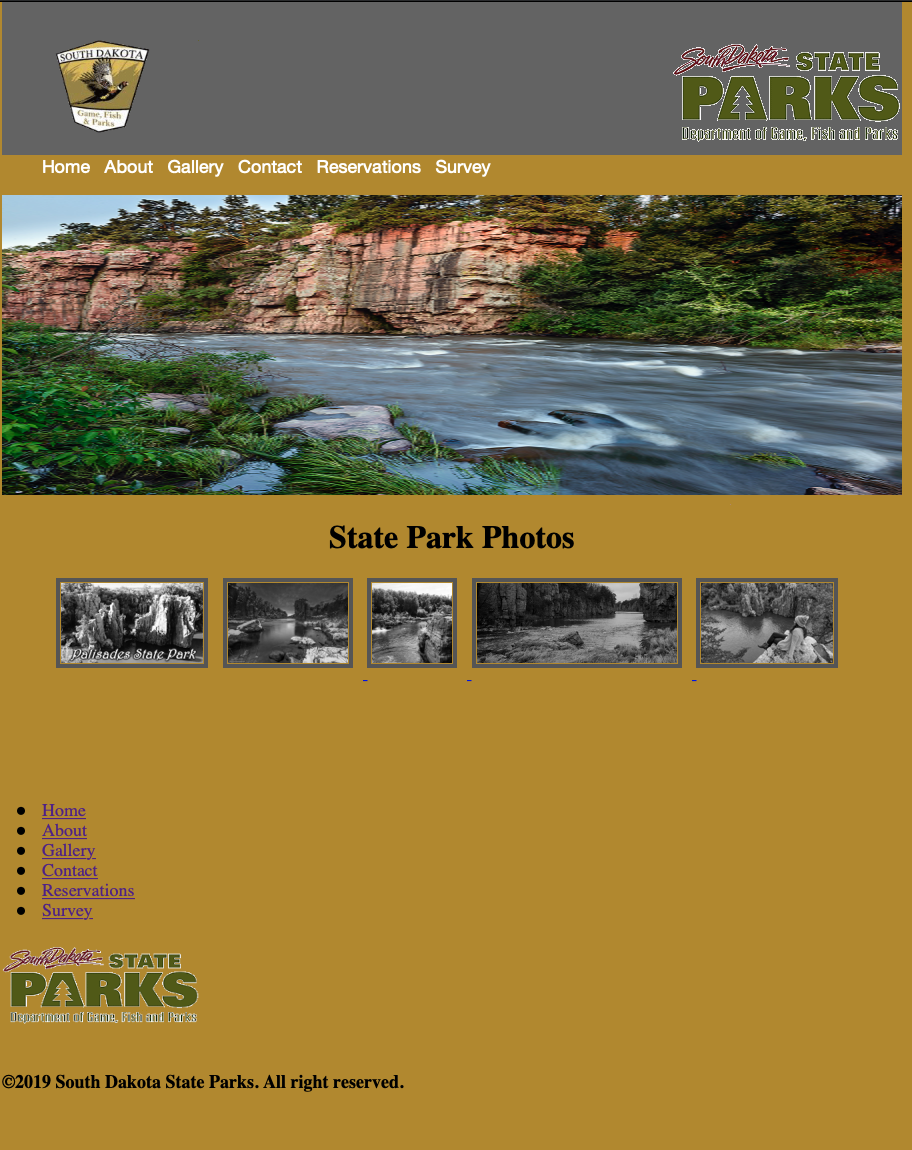Welcome to my web design example site. this website is for demonstration perposes and is in no way affiliated with palasades park or the state of South dakota Parks system. Slide 1 Slide 1 (current slide) Slide 2 Slide 2 (current slide) Slide 3 Slide 3 (current slide) Slide 4 Slide 4 (current slide) Slide 5 Slide 5 (current slide)